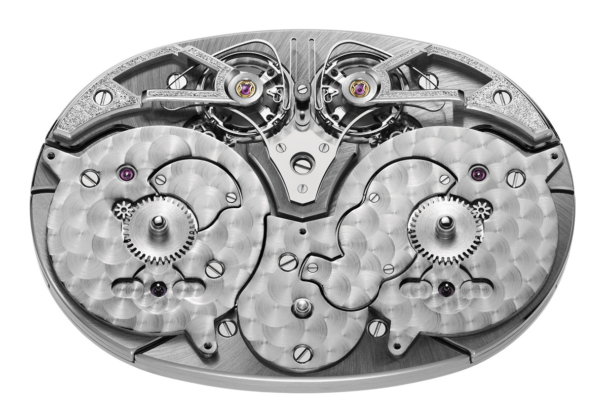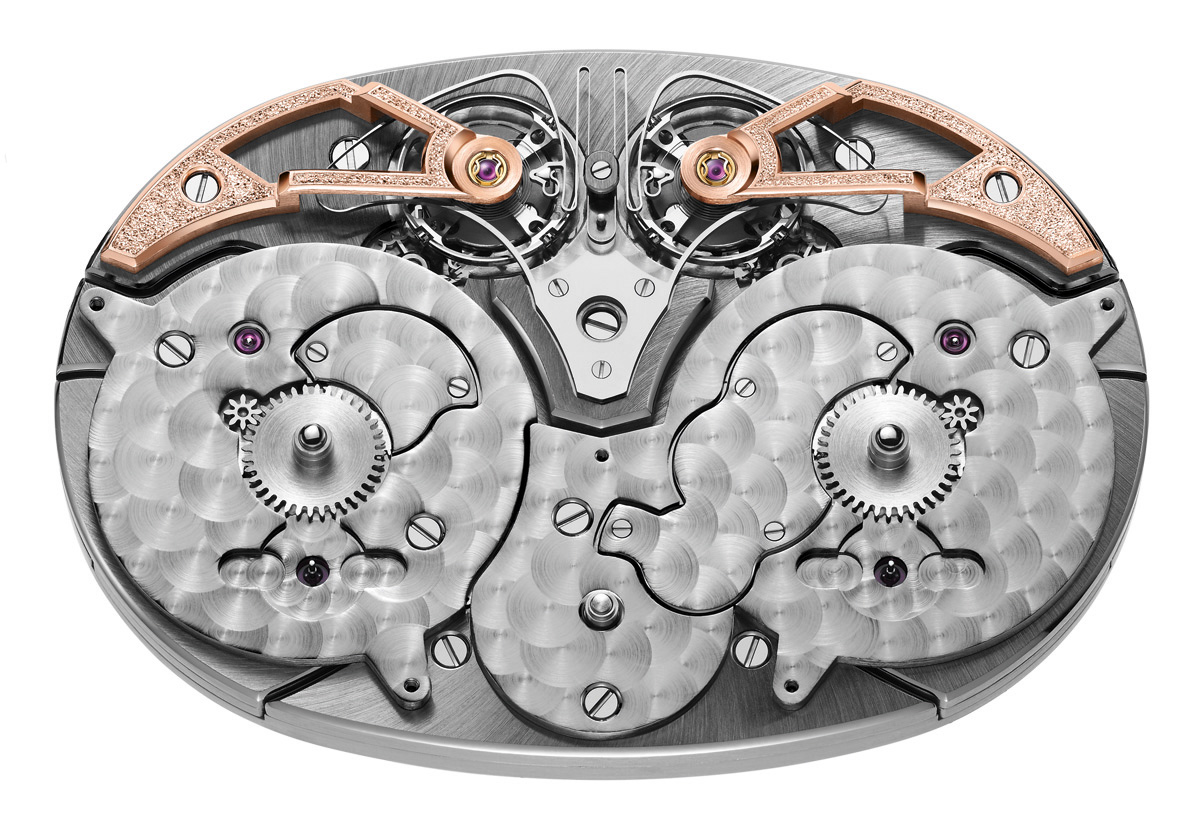 La forme ovale de l’impressionnant boitier de 52,55mm x 39,95mm pour 11,67mm d’épaisseur est une conséquence des deux mouvements indépendants disposés côte à côte. L’indépendance de ses mouvements permet à la Dual Time Resonance d’indiquer l’heure GMT, ou un fuseau horaire secondaire, et de bénéficier d’une fonction de chronomètre ou de compte à rebours.