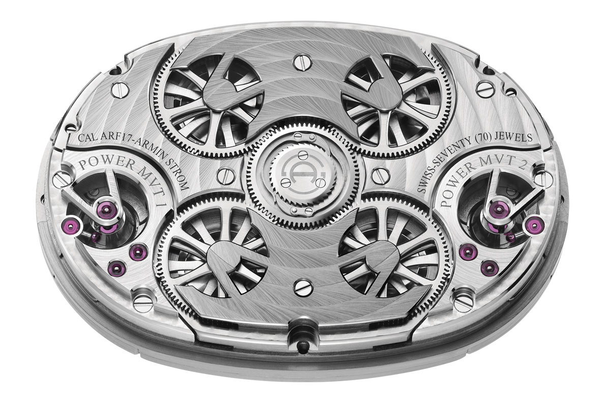 De l’autre coté de la montre, le calibre ARF17 est orné de Côtes de Genève circulaires centrées sur le mécanisme.