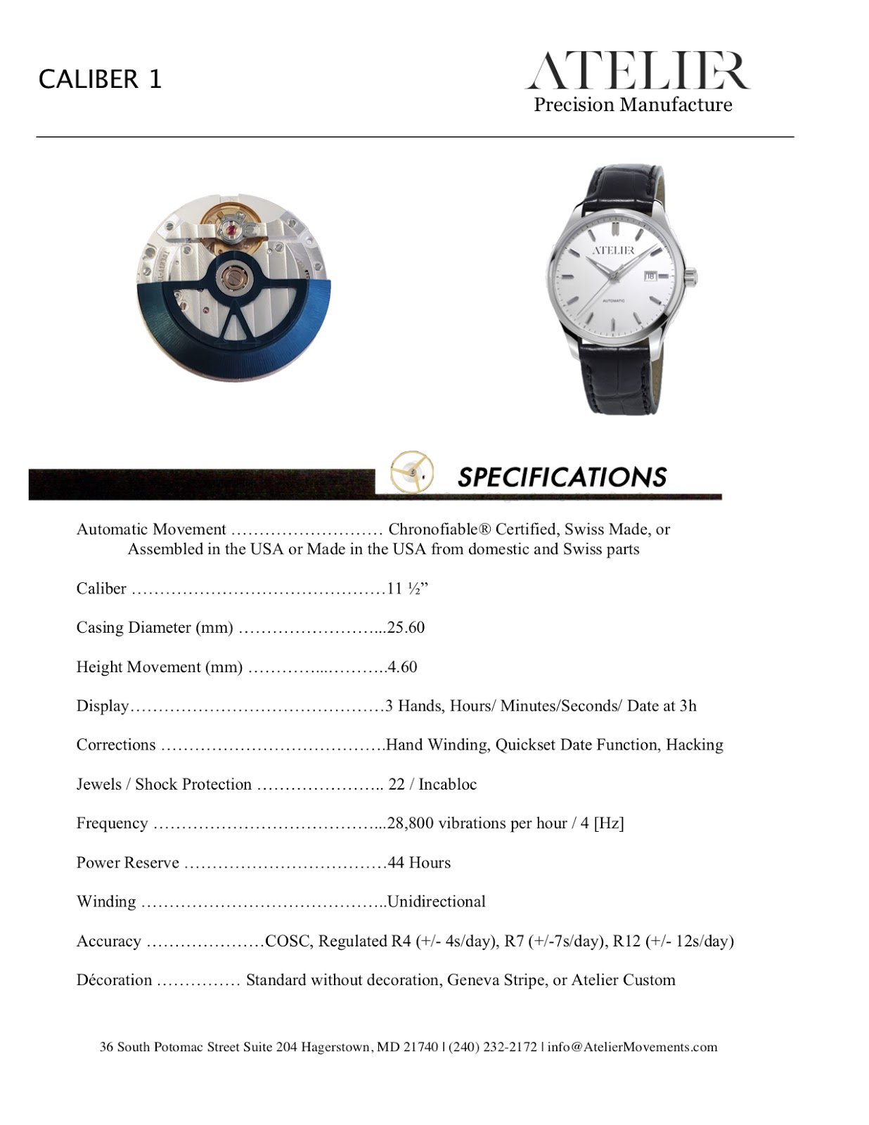 L’un des objectifs de cette alliance américano-suisse qui a conduit à la création d’ Atelier était de développer un calibre 11½’’’ adapté au marché et au volume des États-Unis. Le calibre 1 n’est pas un clone d’un calibre préexistant, mais un remplaçant pour les marques qui utilisent actuellement les ETA-2824 .
