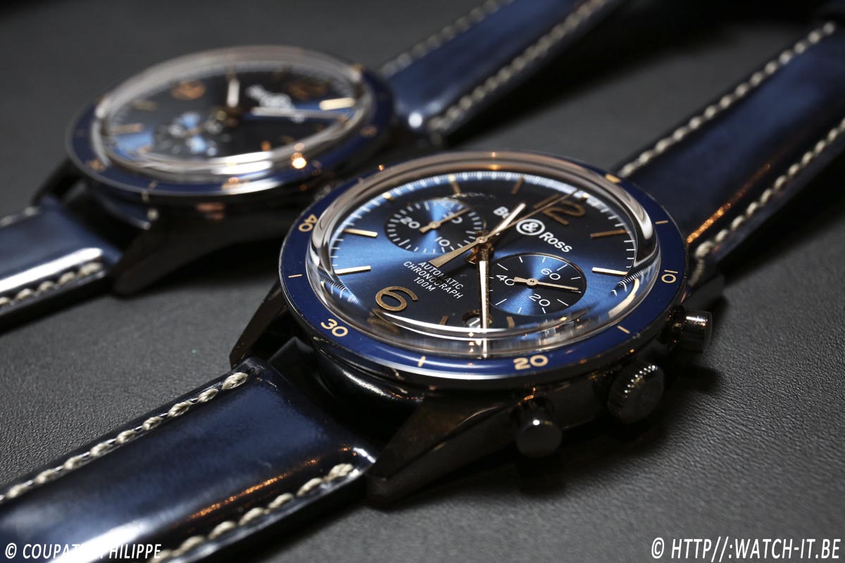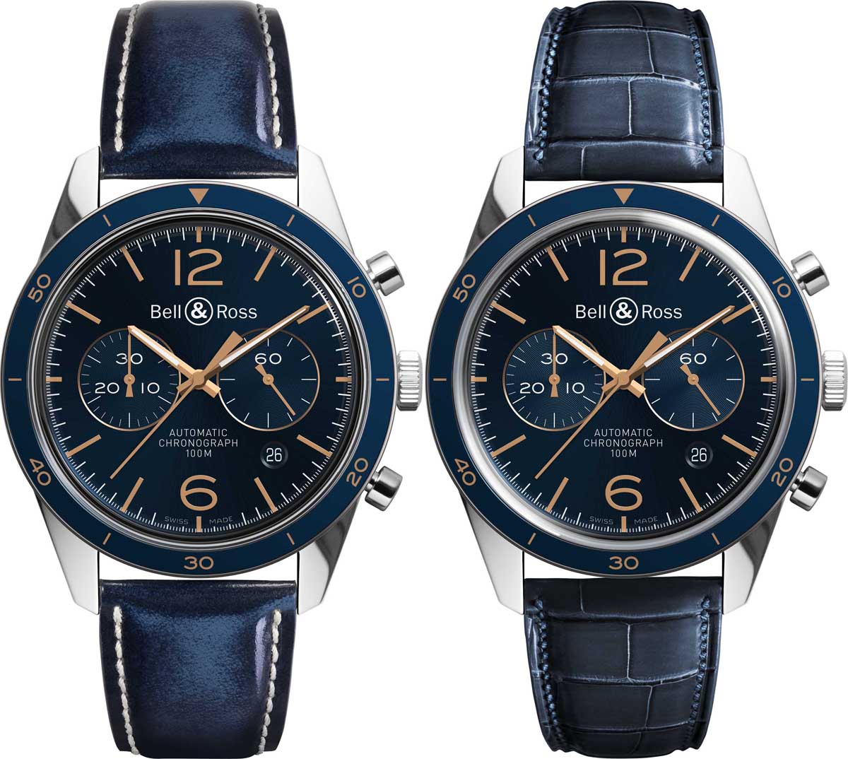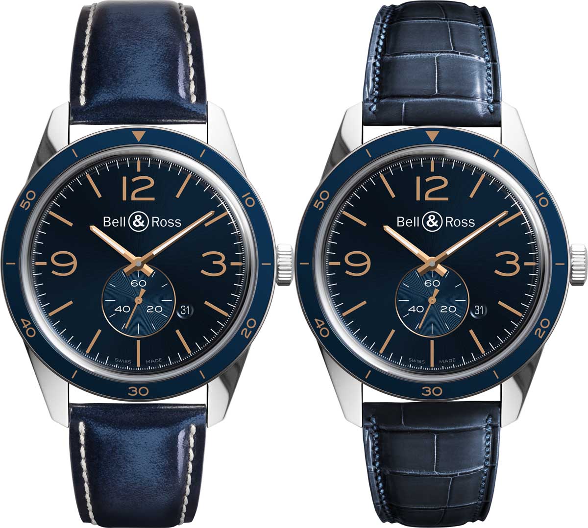 La marque française Bell & Ross présente deux nouvelles montres rondes se rajoutant à la gamme Vintage BR Aeronavale, un modèle à trois-aiguilles, la BR 123, et un chronographe, la BR 126, toutes deux en couleur bleu et dorée rappelant les uniformes des officiers de la Marine.