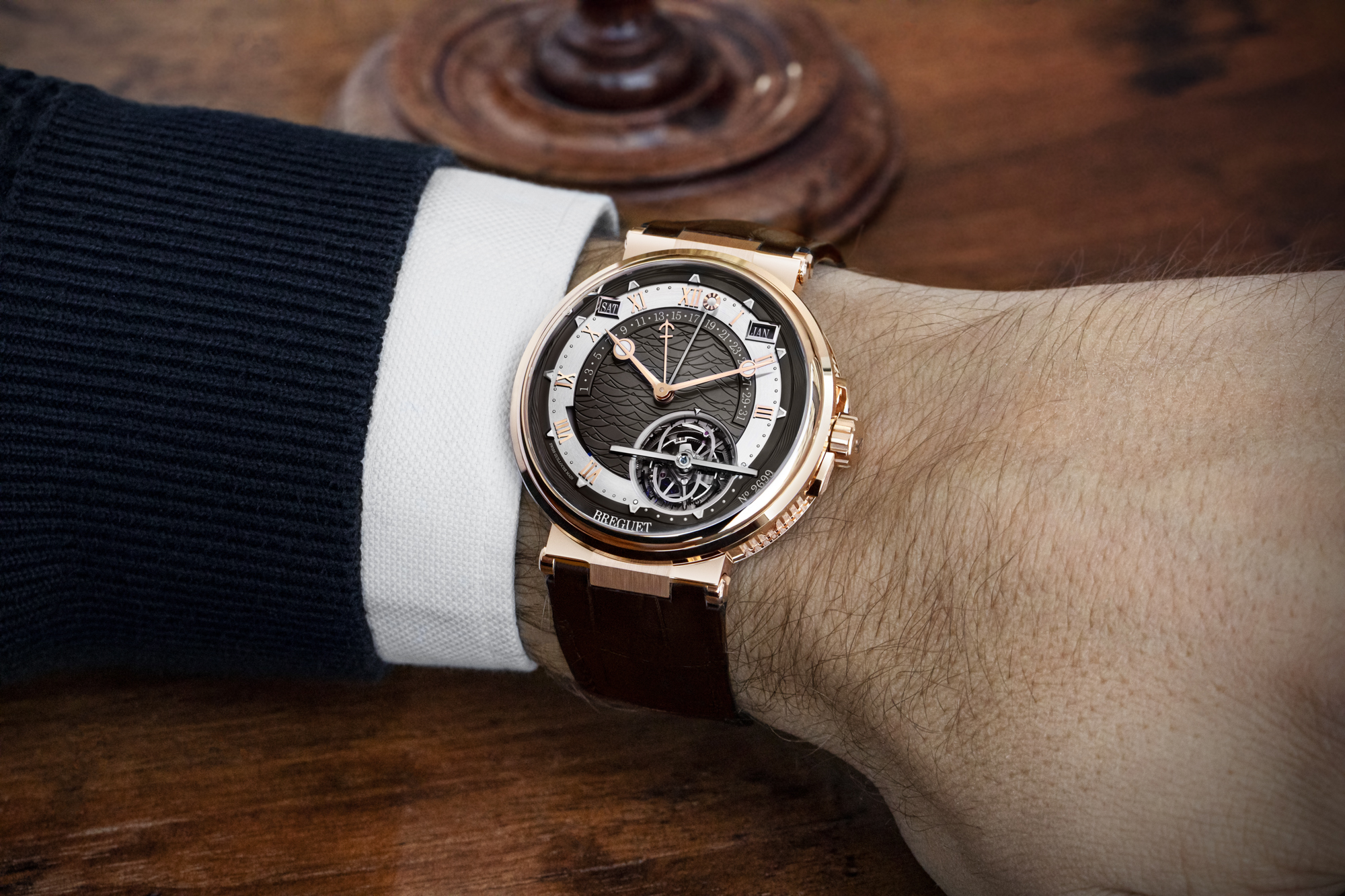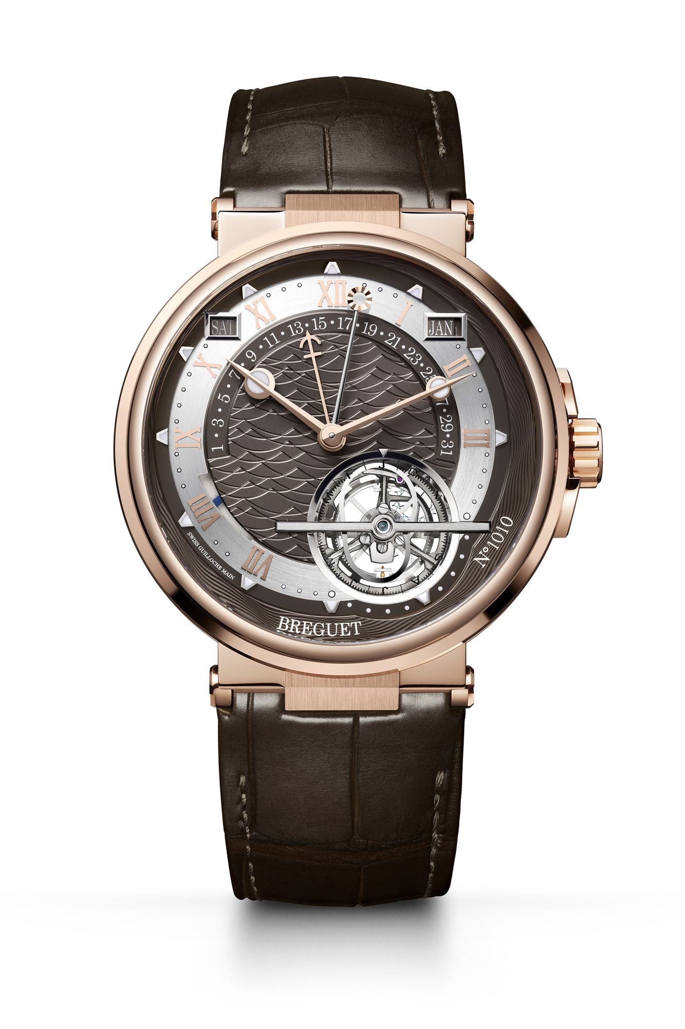 La Maison Breguet décline le modèle Marine Tourbillon Équation Marchante 5887 en or rose avec un cadran en or de couleur ardoise et toujours avec un mouvement à complications et des décorations raffinées.