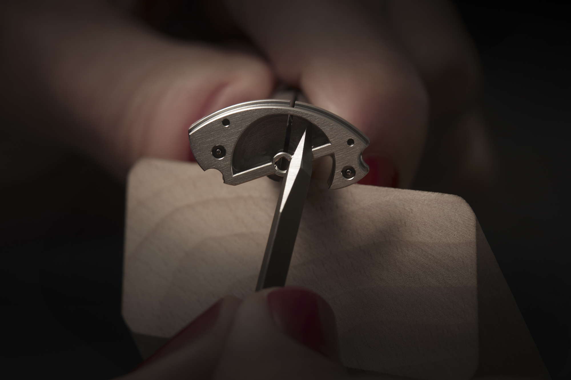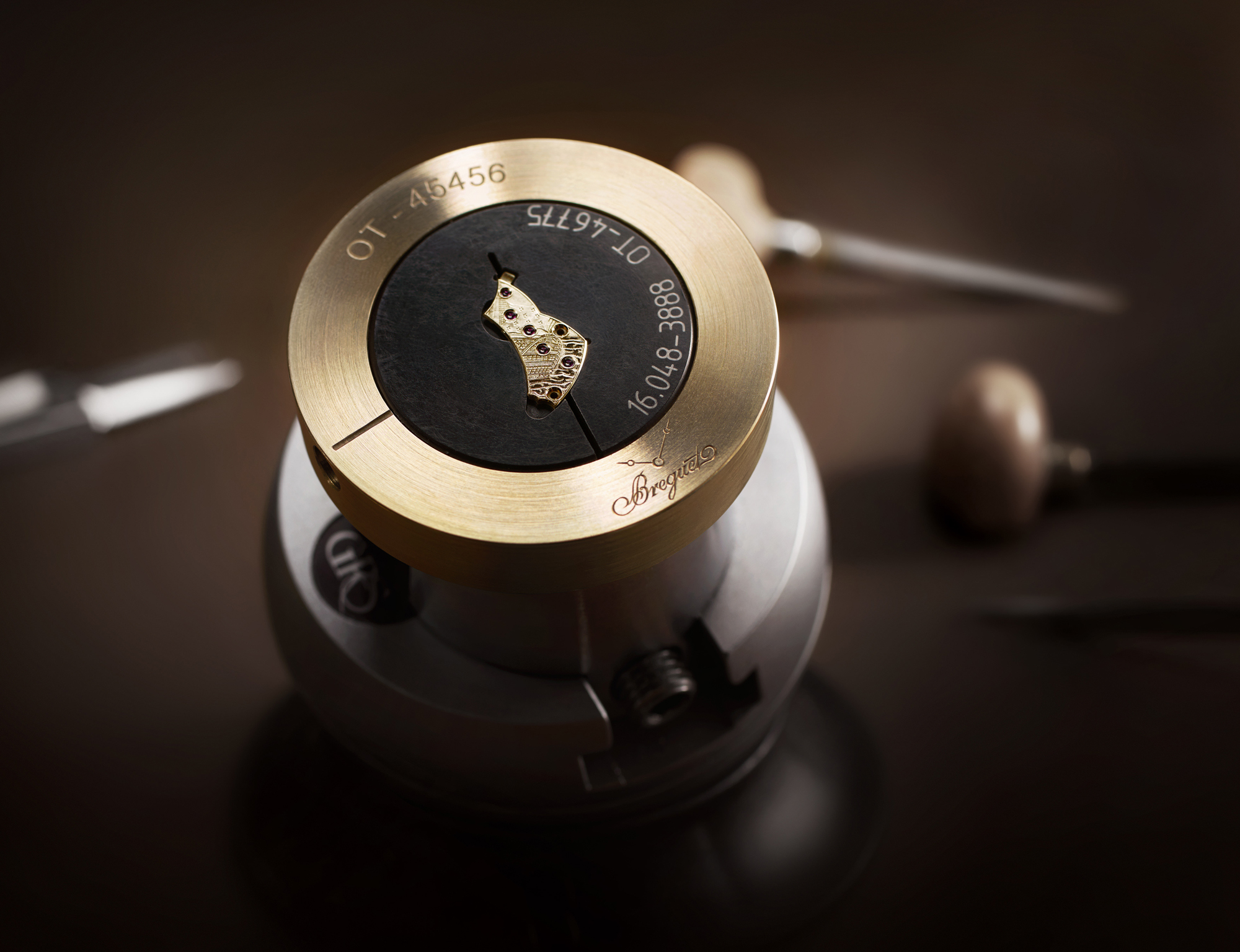Le travail se doit d’être extrêmement précis afin que les traits de l’image s’alignent parfaitement une fois le mouvement monté. Le tambour de barillet arbore une rose des vents également gravée à la main. La masse oscillante périphérique en platine, guillochée et gravée du nom Breguet, offre une vue totalement dégagée sur l’ensemble du mouvement et de ses décorations.