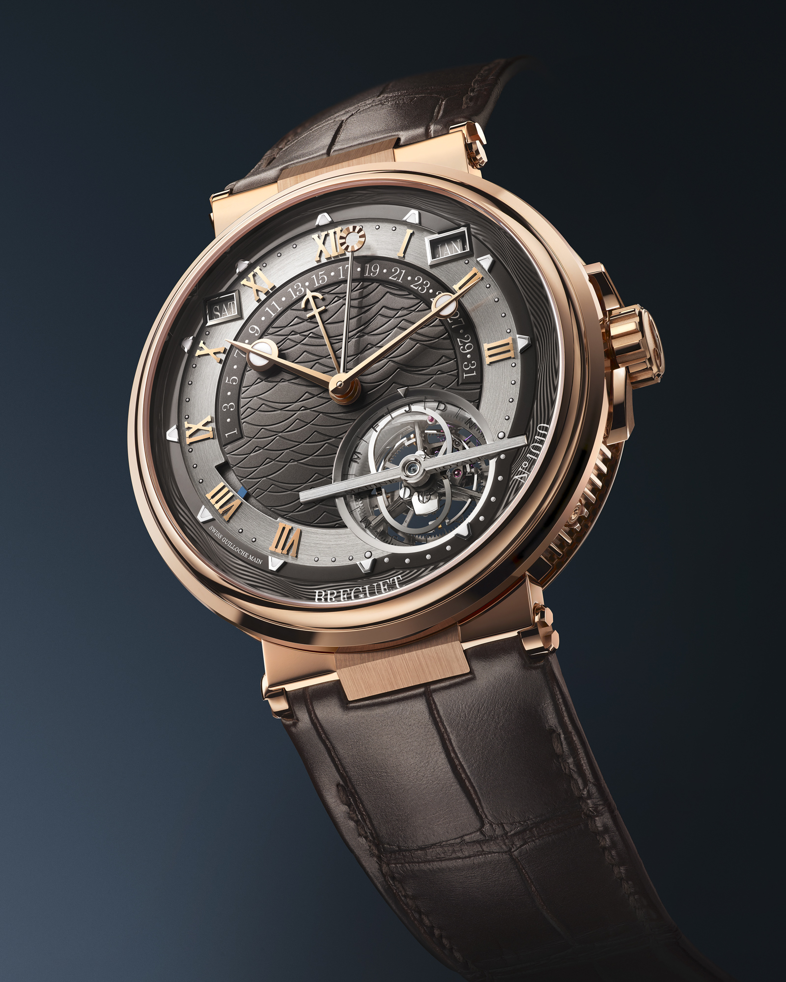 Pour souligner le lien entre la ligne Marine et la mer, le guillochage dessine des crêtes de vagues au centre du cadran en or. Les chiffres romains en appliques tout comme les aiguilles Breguet à « pomme » sont en or rose.