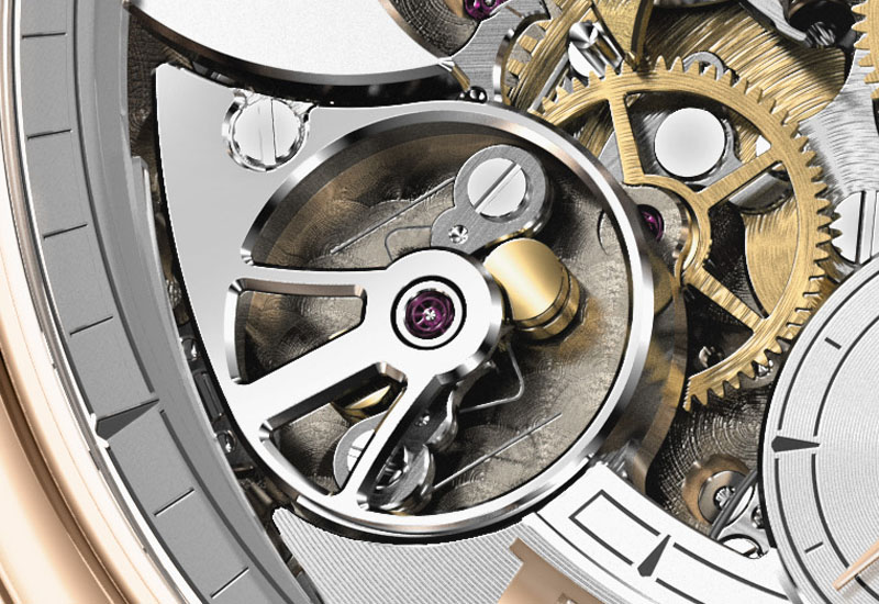 N’oublions pas que le mouvement et la boîte sont porteurs du Poinçon de Genève. Par exemple, cela stipule que les ressorts ne peuvent être des fils, mais doivent comporter un talon et être décorés. Ici ceux qui tiennent les masselottes du régulateur mesurent 7/100e de millimètre….