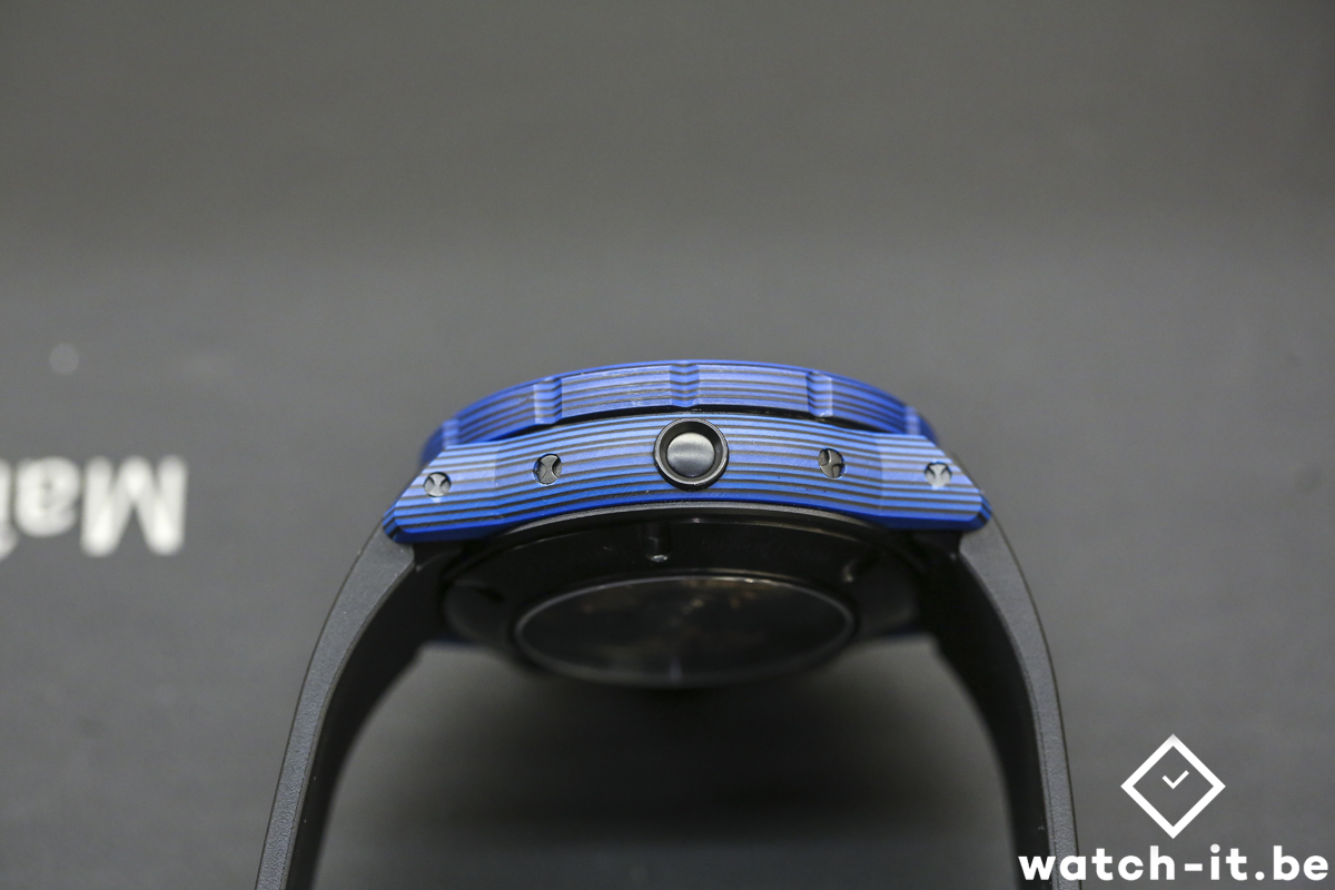 Edox utilise un matériau de conception nouvelle qui est beaucoup plus résistant aux rayures et à l’usure générale que le carbone normal. Constitué d’une couche de céramique forgée dans une résine avec des fibres de carbone noir et de fibres de verre, il donne également une couleur et une texture distinctives.