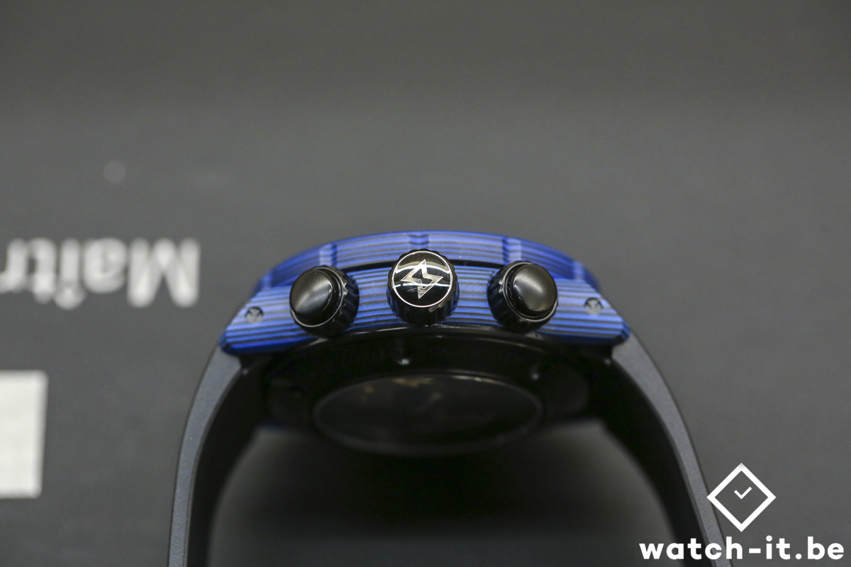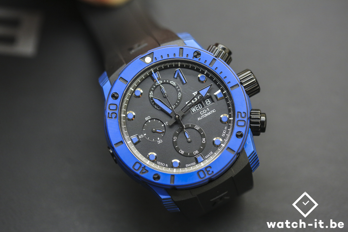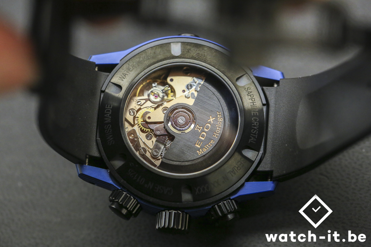 L’ EDOX C-01 de 45 mm est alimenté par un mouvement chronographe Edox Calibre 011 (basé sur le Sellita SW500) avec un boîtier en carbone et waterproof jusqu’à 500m. Ce chronographe automatique est équipé d’un guichet jour et date, une couronne et poussoir avec double joint O’ring ainsi qu’une valve à hélium,