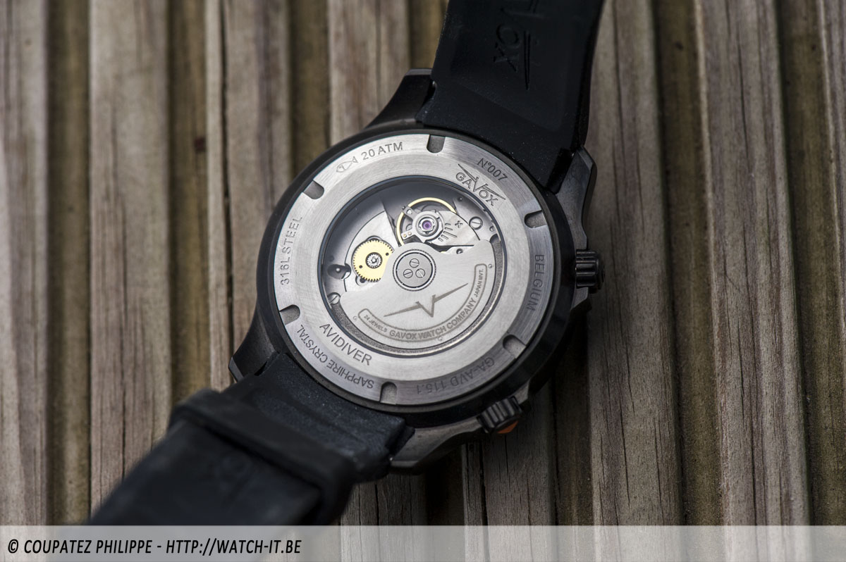 Le fond vissé et transparent de la Gavox Avidiver est gravé avec les informations clefs de la montre ainsi que son numéro de série. Le verre minéral vous permet de voir la décoration du Miyota 9015 (cotes de Genève et masse décorée avec le logo de Gavox spécialement pour ce modèle)