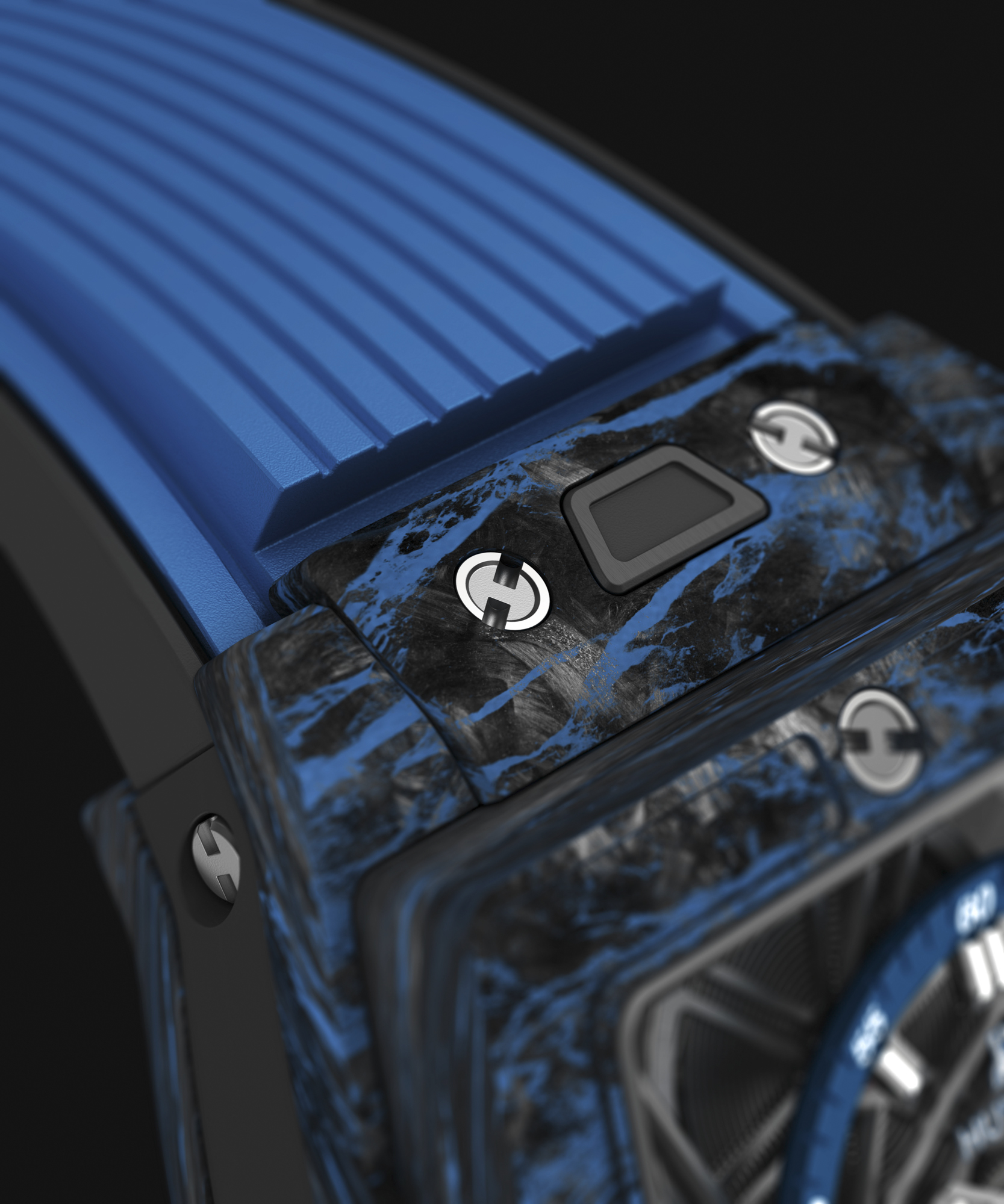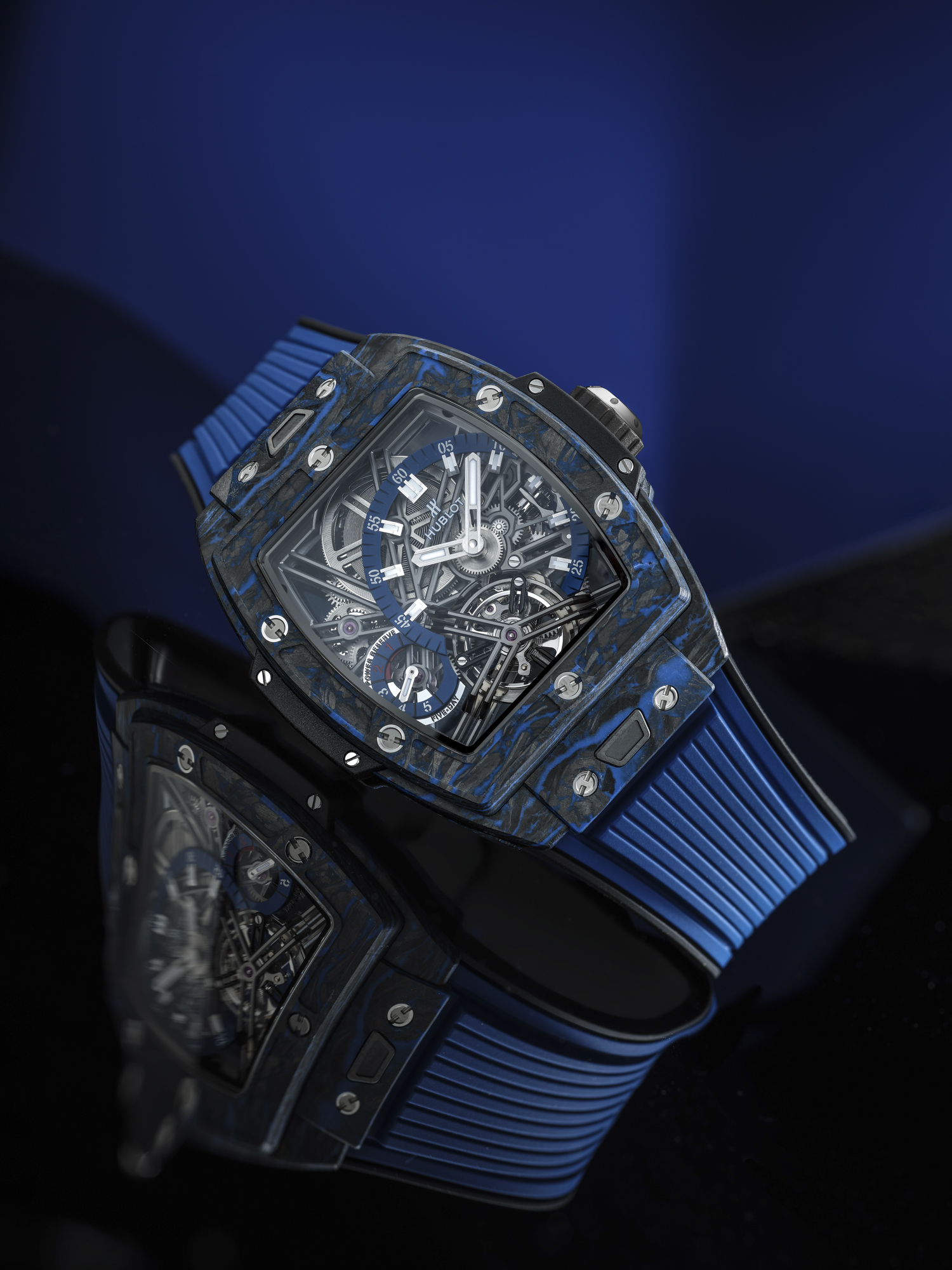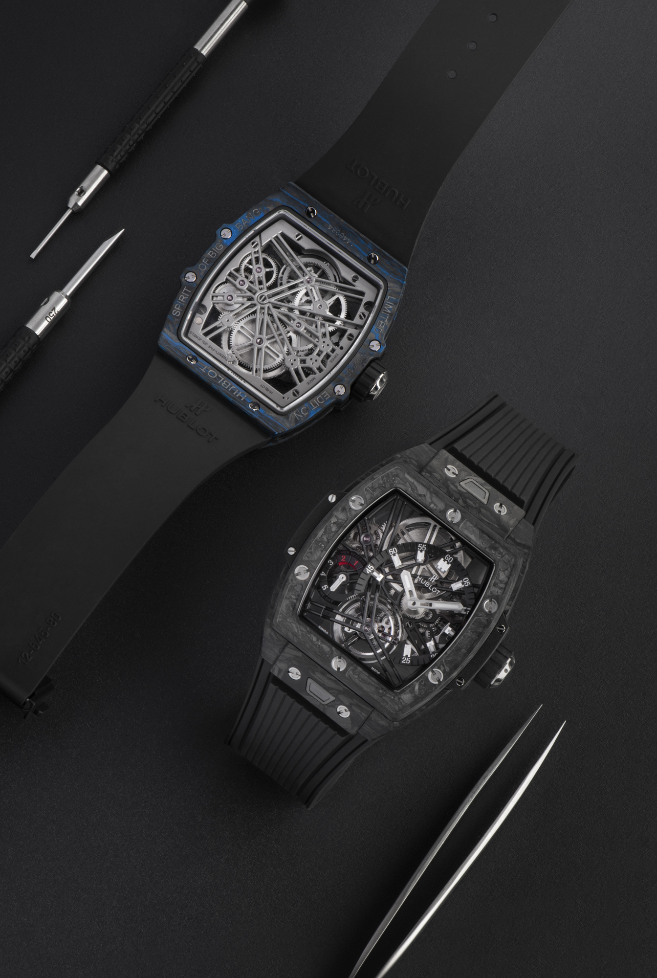 Les deux éditions limitées carbone composites noirs et carbone composites bleus de 100 exemplaires chacune sont proposées avec un bracelet en caoutchouc structuré et ligné respectivement noir ou bleu/noir.