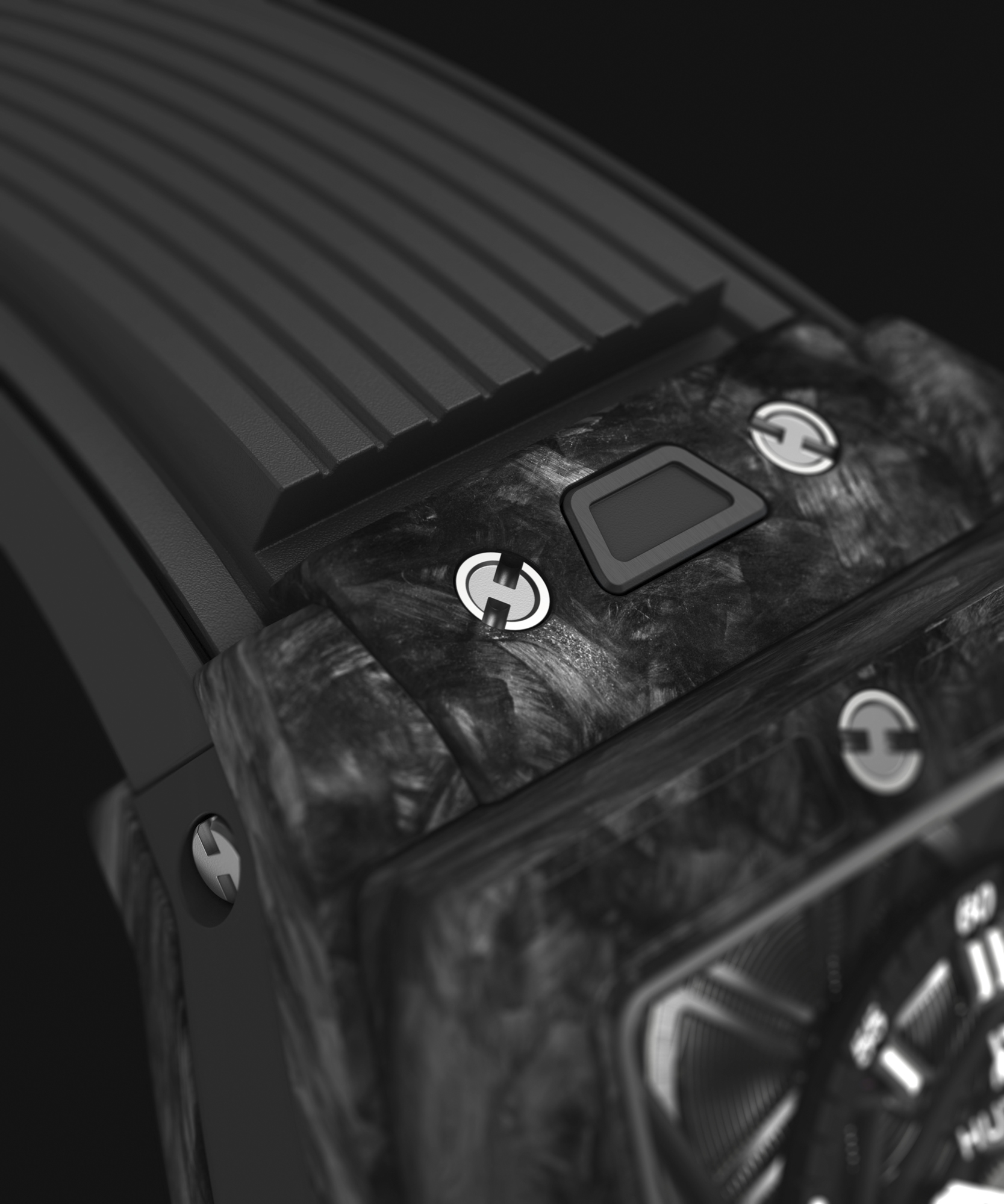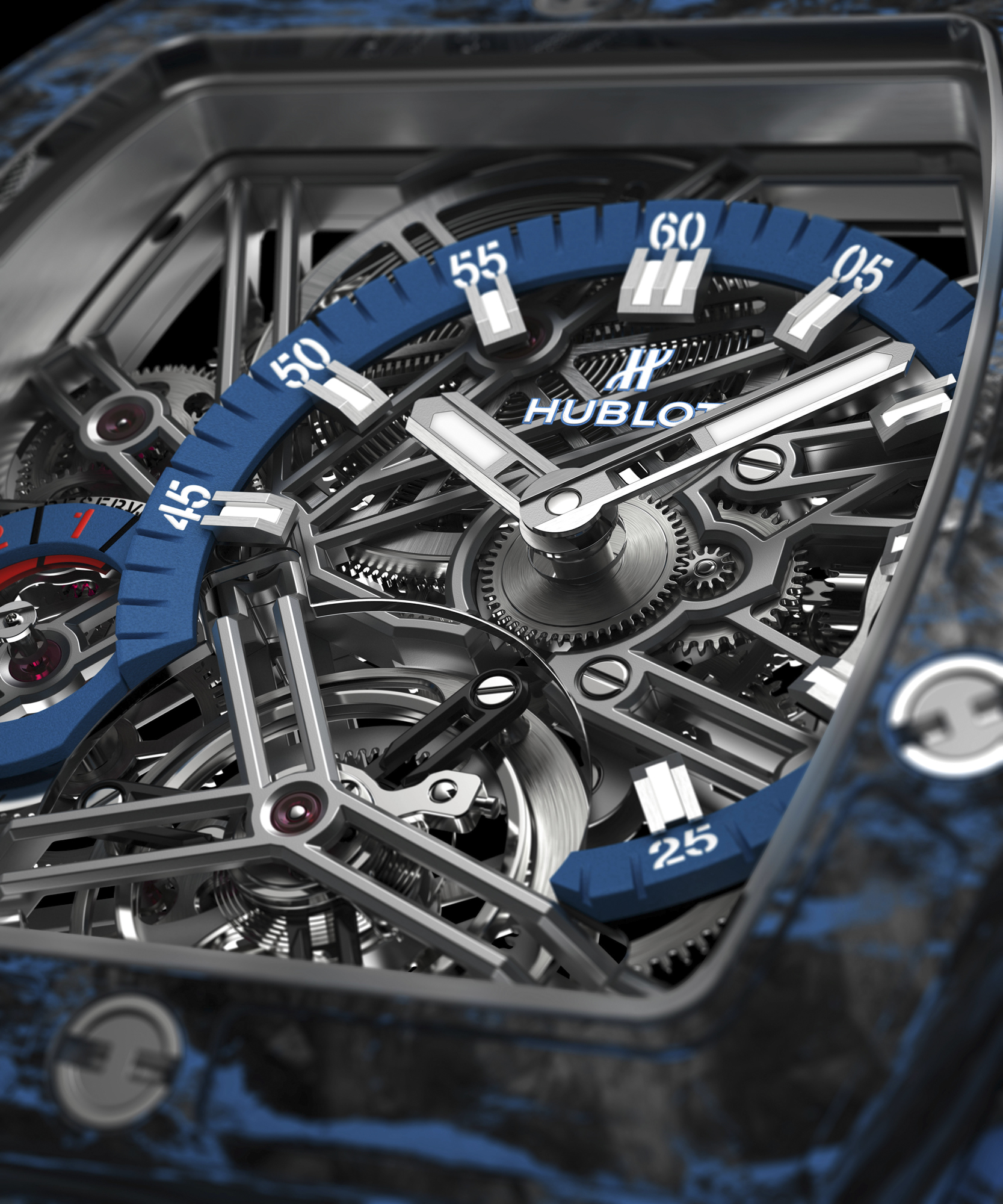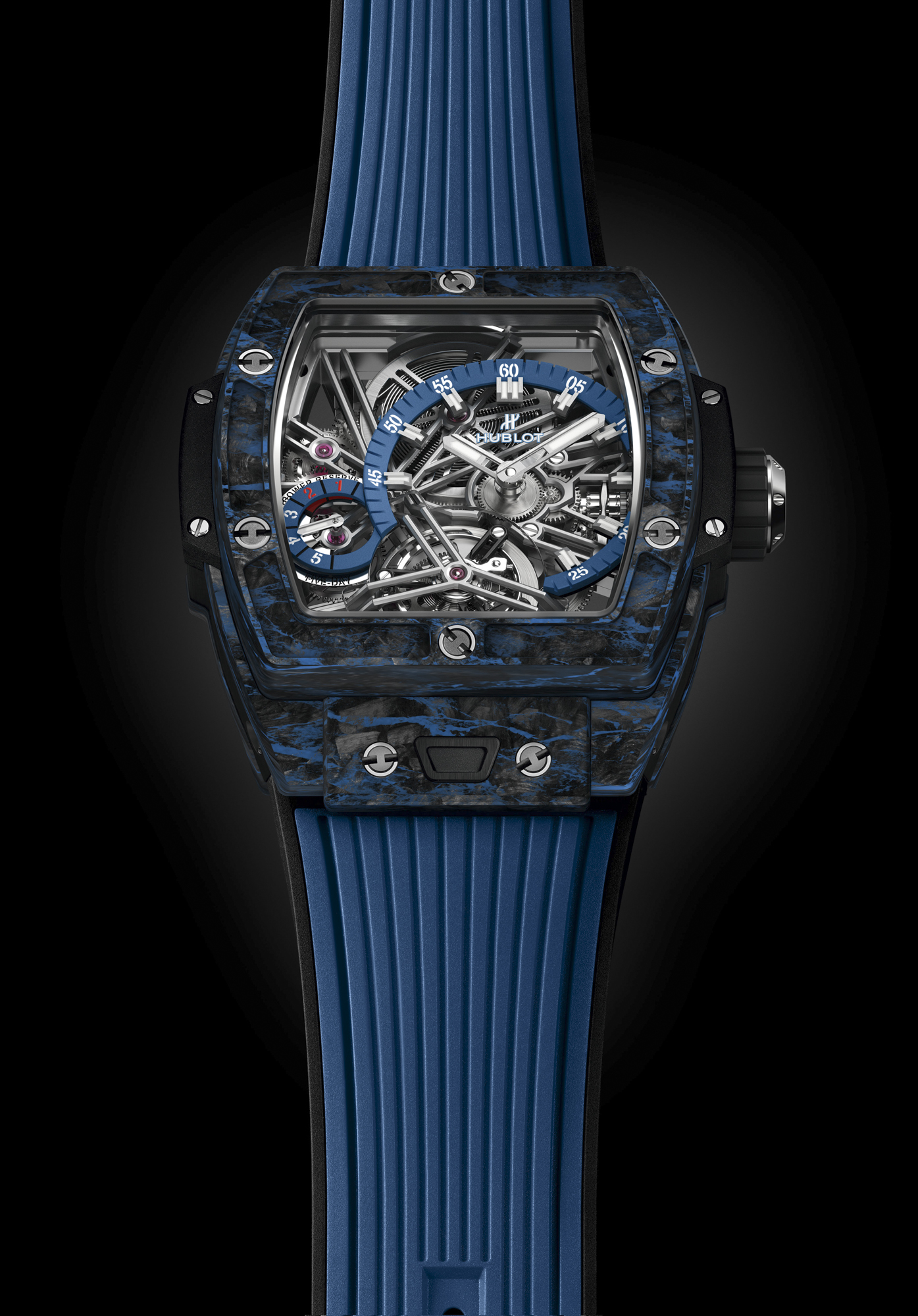 Les deux éditions limitées carbone composites noirs et carbone composites bleus de 100 exemplaires chacune sont proposées avec un bracelet en caoutchouc structuré et ligné respectivement noir ou bleu/noir.