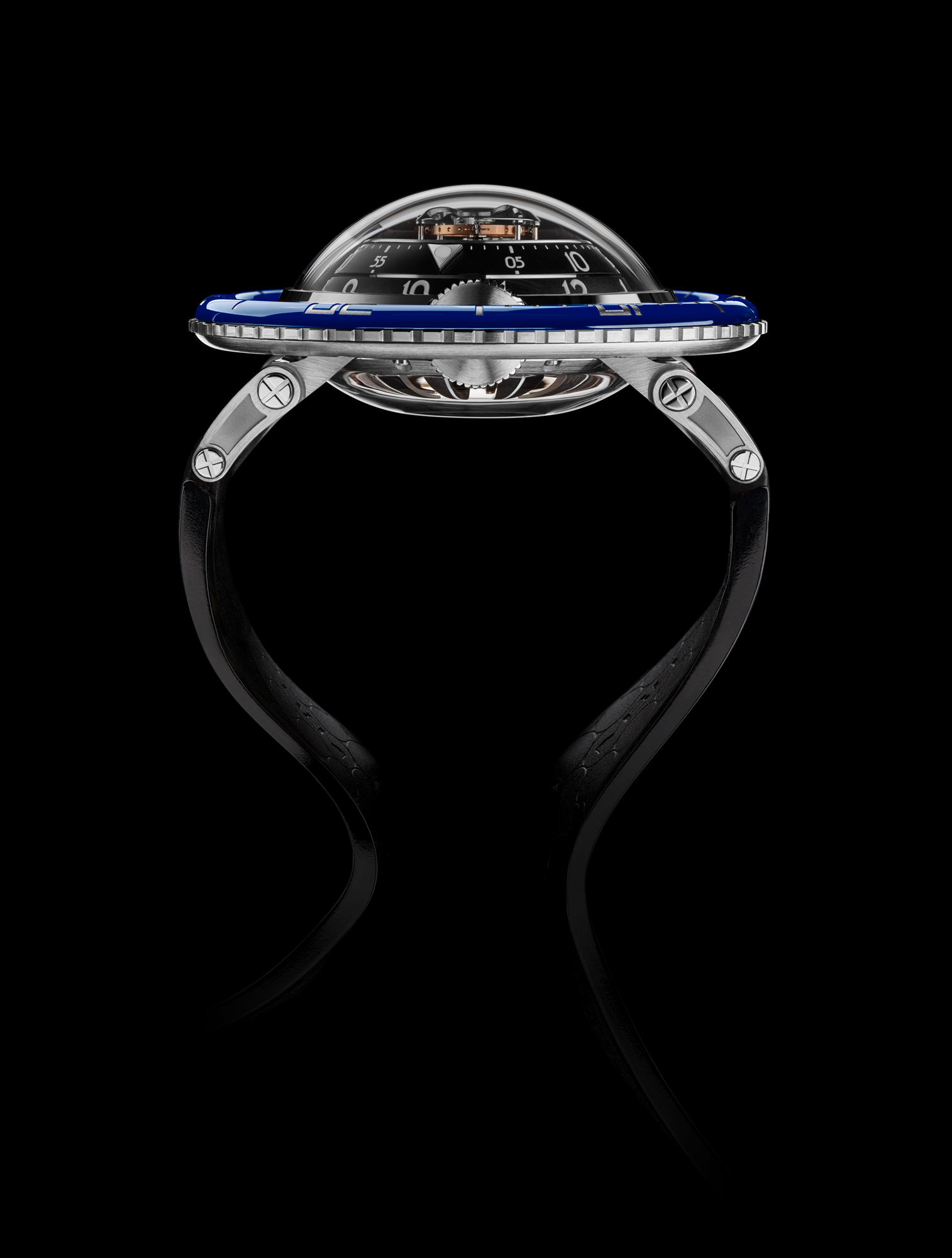 - Mouvement à architecture verticale tridimensionnelle et remontage automatique, conçu et développé à l’interne par MB&F.