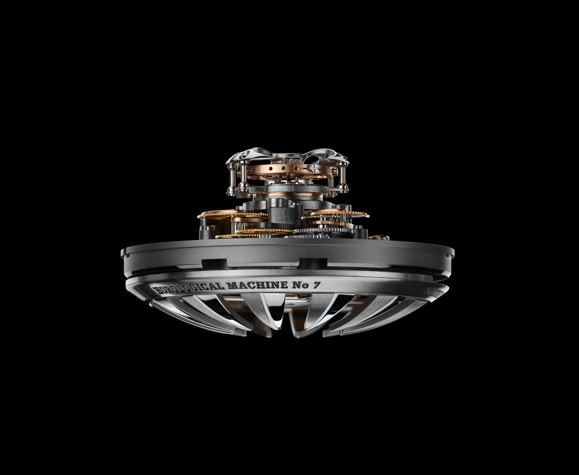 » Le choix d’un tourbillon volant s’est imposé car le pont supérieur d’un tourbillon usuel aurait nécessité l’emploi d’anneaux d’affichage plus petits et moins lisibles. On pourra apprécier pleinement la rotation du tourbillon volant à tout moment, de jour grâce à sa position tout en haut du mouvement, de nuit grâce à l’illumination de trois panneaux — recouverts de matière luminescente AGT Ultra (Ambient Glow Technology) — placés autour du mouvement. » -MB&F