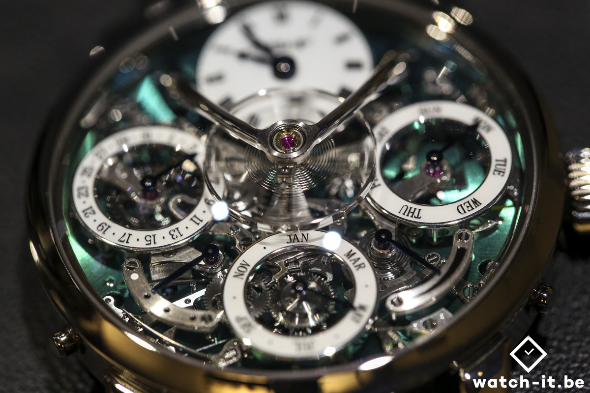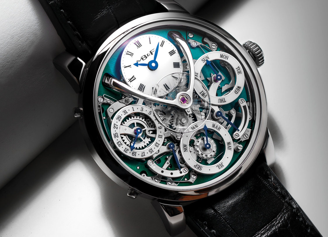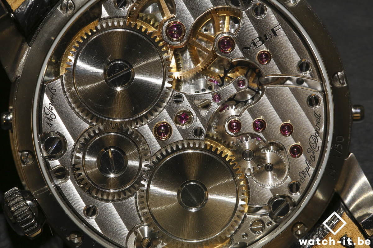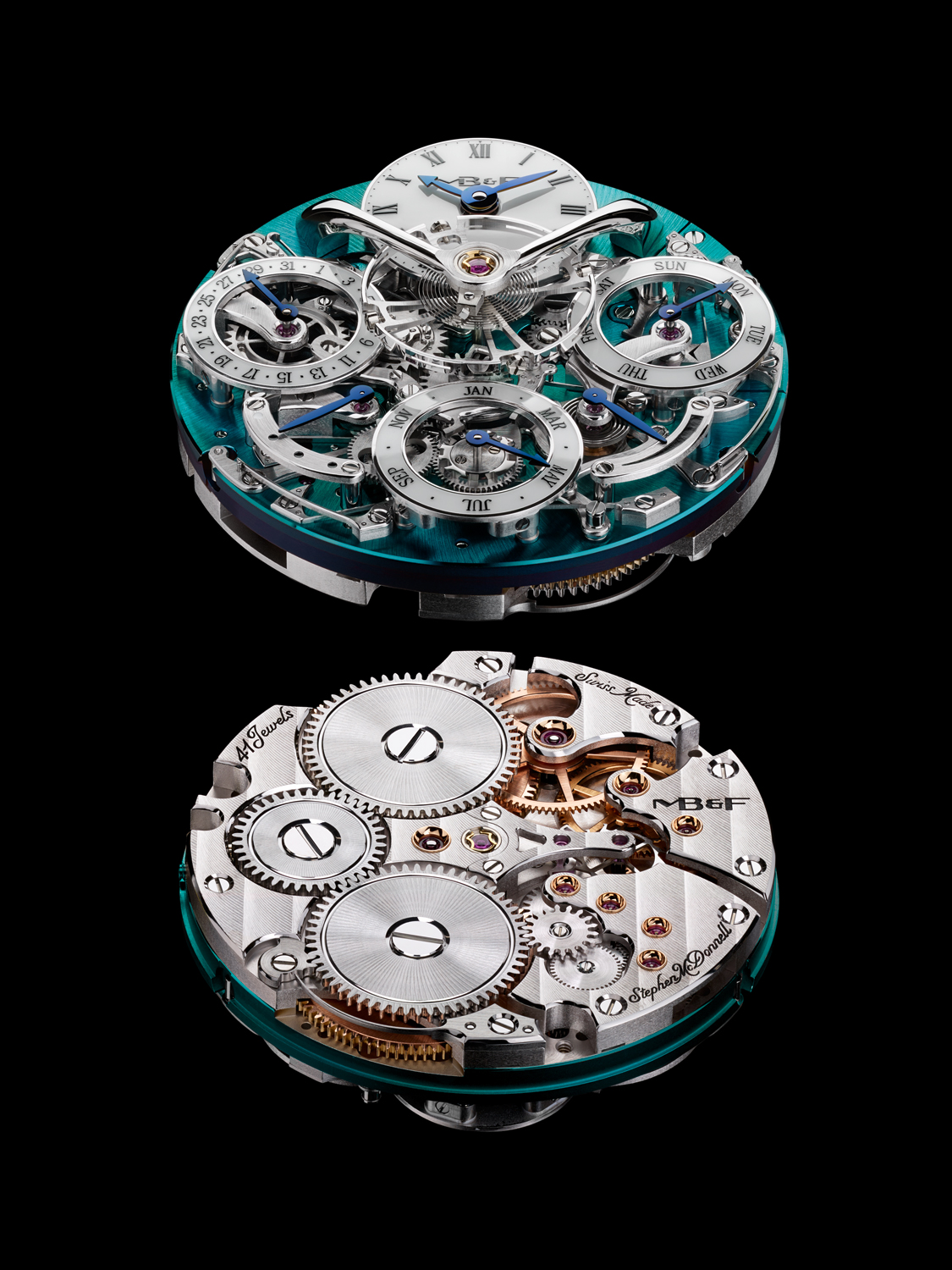 • Calendrier perpétuel entièrement intégré développé pour MB & F et Stephen McDonnell avec complication coté cadran avec mécanisme de sécurité intégré.