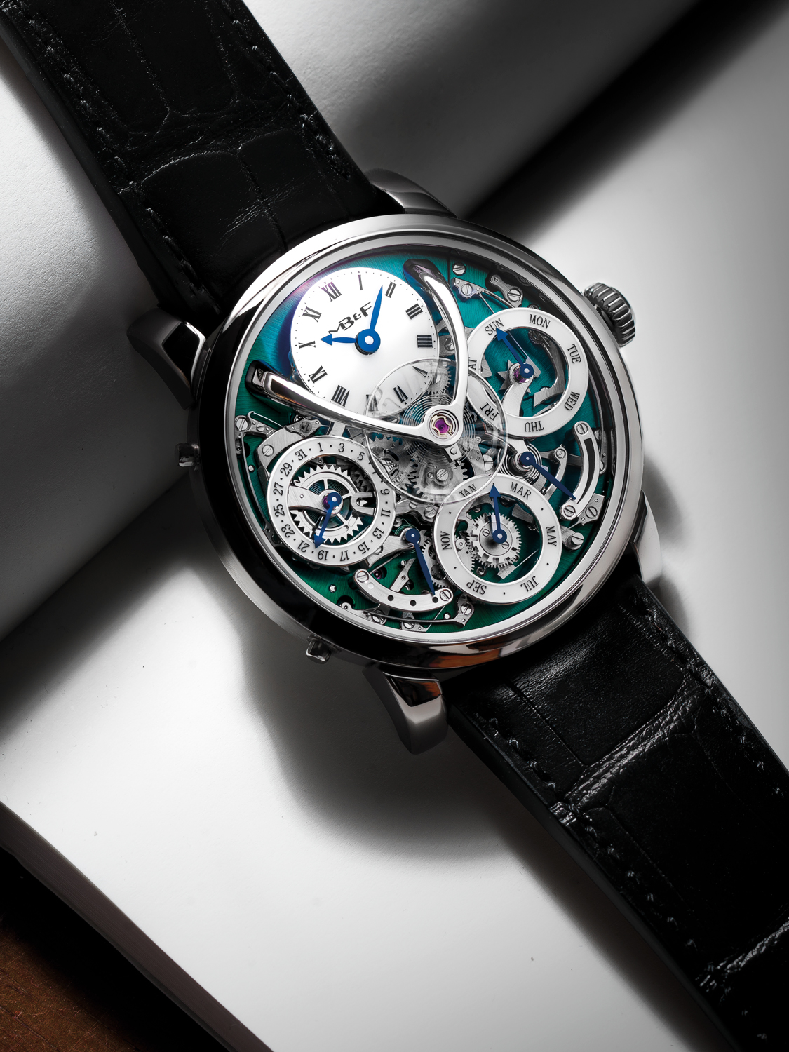 Côté esthétique, ce calendrier perpétuel réinterprète le design traditionnel de manière holistique, en présentant la complication dans son ensemble, et sans recours à un cadran, le tout surplombé d’un impressionnant balancier suspendu.