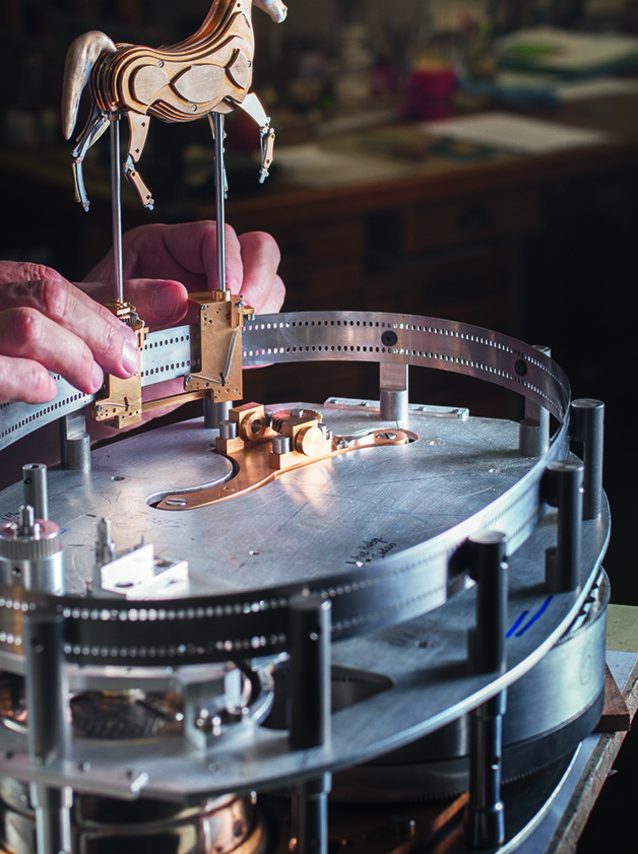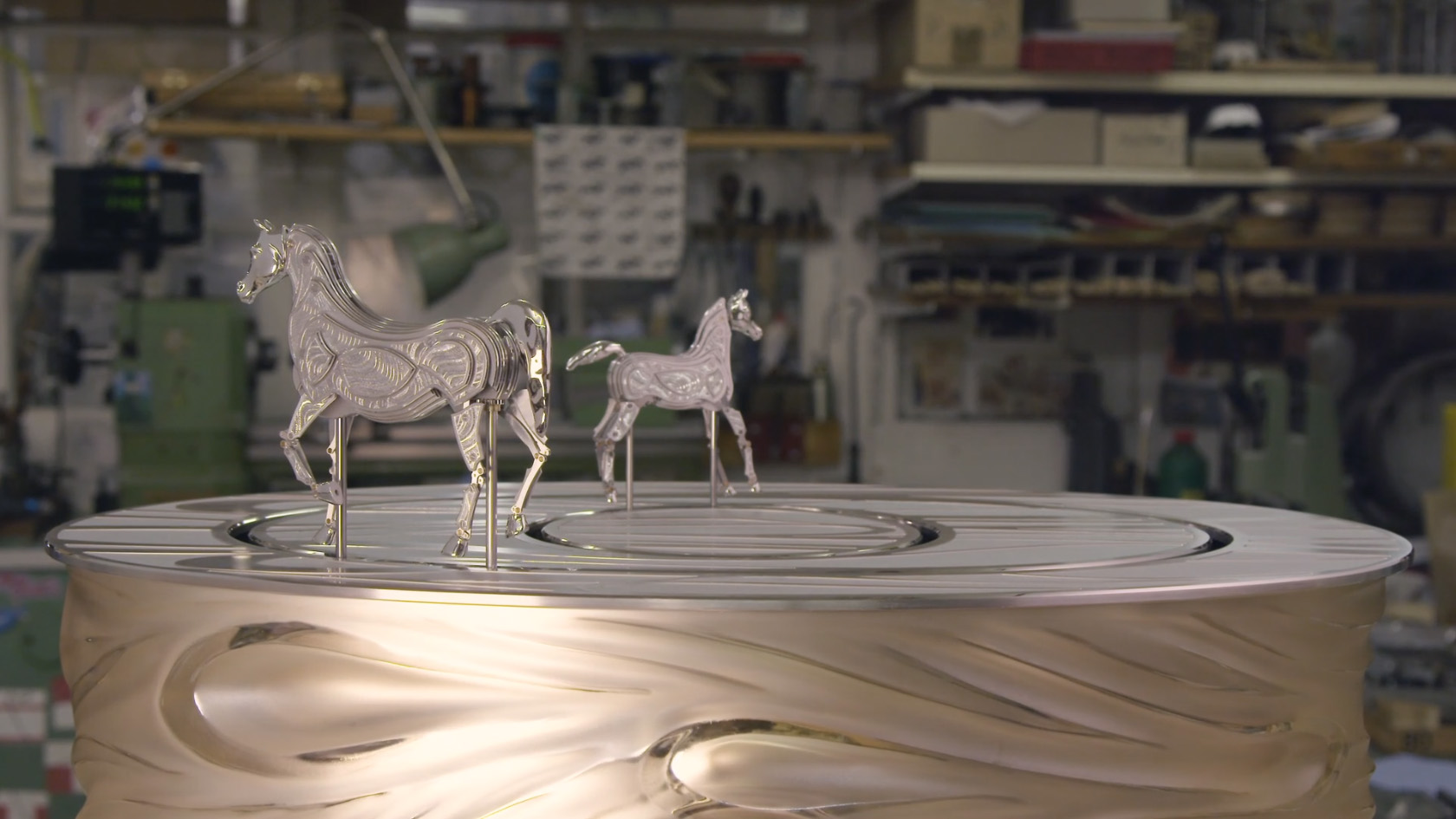 La jument et son poulain sont envisagés comme un mouvement horloger. La tête, la queue et les sabots sont des moulages en argent polis à la main par un bijoutier. Les équidés évoluent sur un cabinet de cristal ovale réalisé par la Maison Lalique.