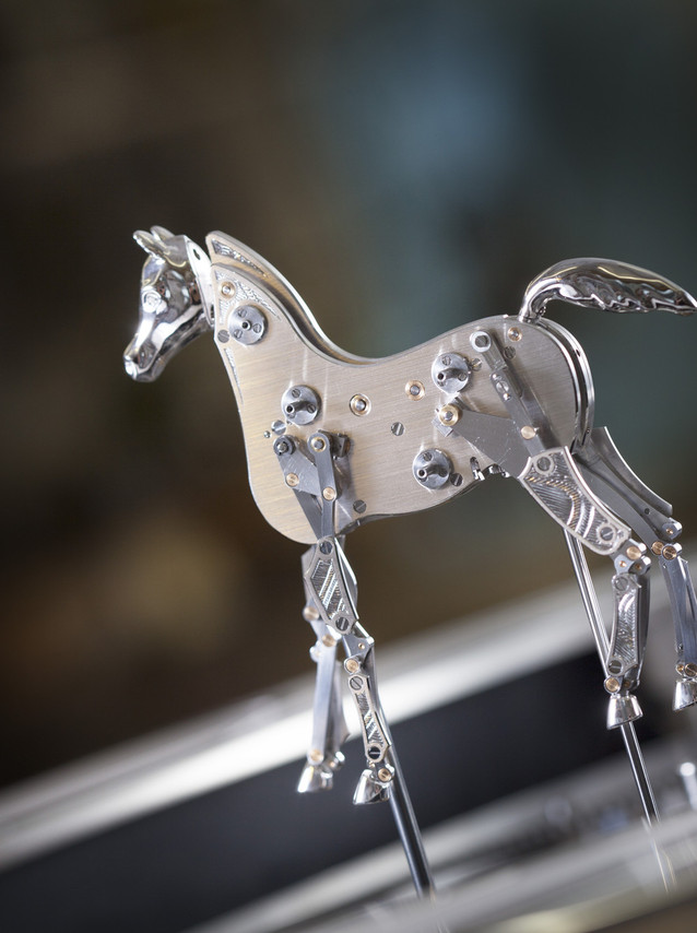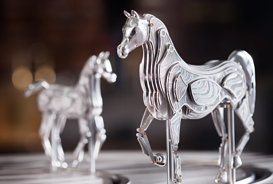 L’automatier à ici imaginé la course d’une jument et de son poulain au mouvement silencieux et à la fluidité impressionnante, ils possèdent une décoration gravé à la main, tandis que le mécanisme de la pendule de table présente des finitions de tradition classique de la Haute Horlogerie. Cette Hippologia incarne parfaitement les savoir-faire mêlés entre le designer, l’horloger, l’automatier et le cristallier.