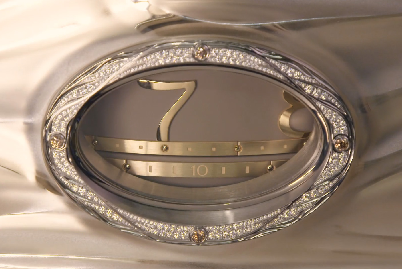 Le guichet serti de diamants blancs et champagne indique les heures et les minutes sur trois heures, ainsi que la graduation qui permet de régler la course des automates à l’heure souhaitée.