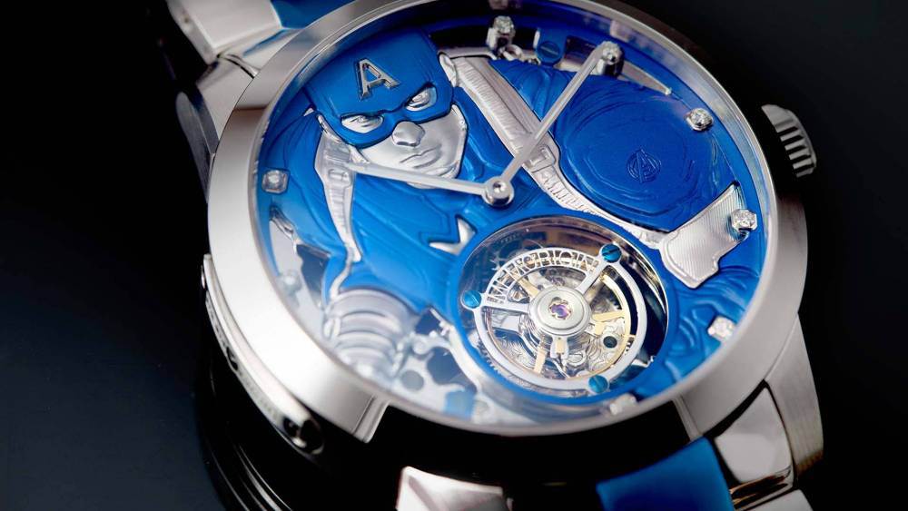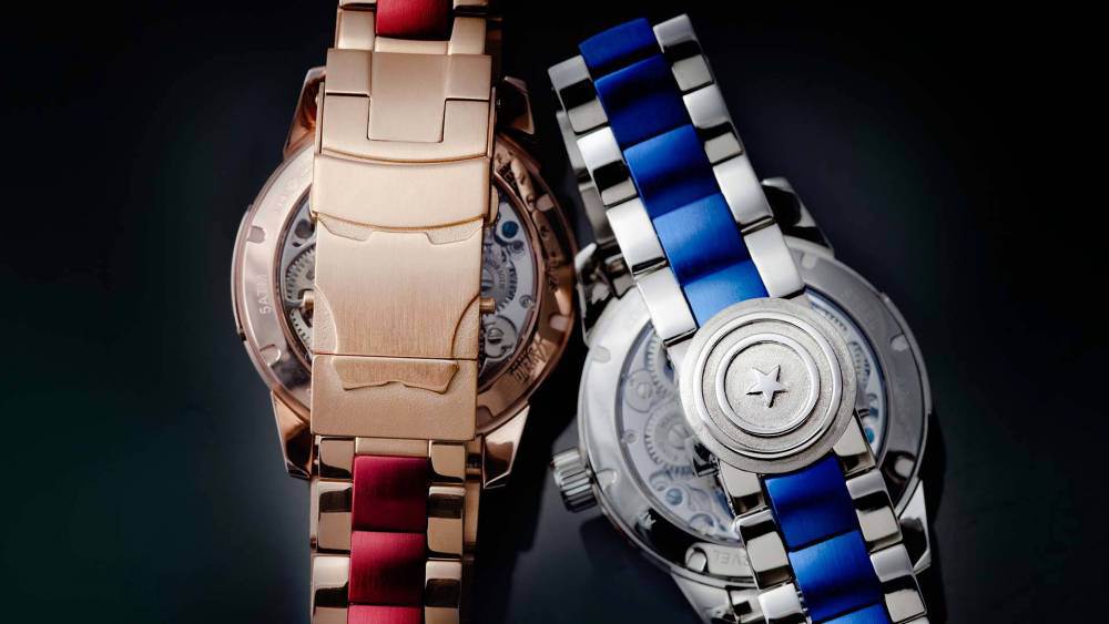 Plutôt que de se contenter d’une simple montre avec les codes couleur des deux personnages, Memorigin multiplie les références aux caractéristiques des deux personnages : cadrans en trois dimensions, diamants dans la paume d’Iron Man, boucle en forme du bouclier en vibranium de Captain America…