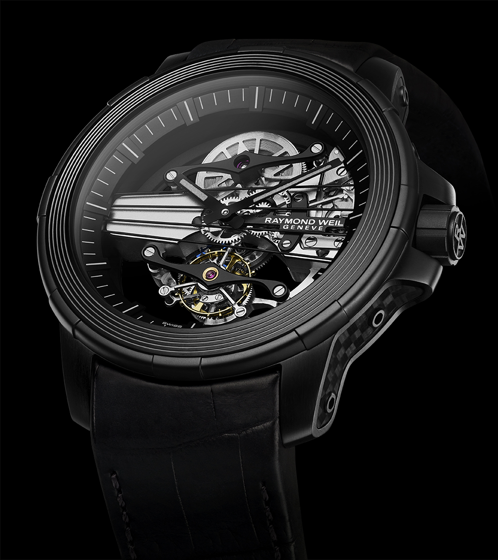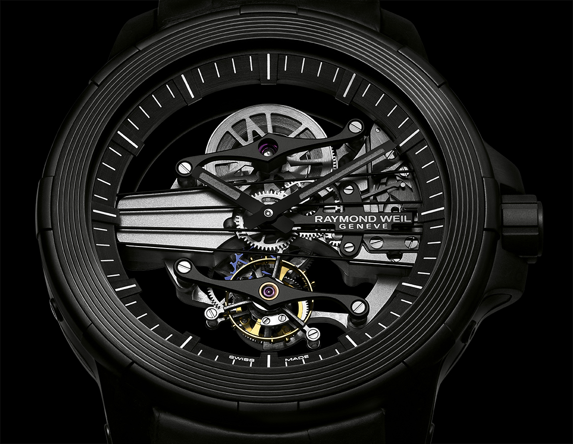 Pour la première fois, Raymond Weil a incorporé un tourbillon dans une de ses montres avec sa Nabucco Cello Tourbillon.