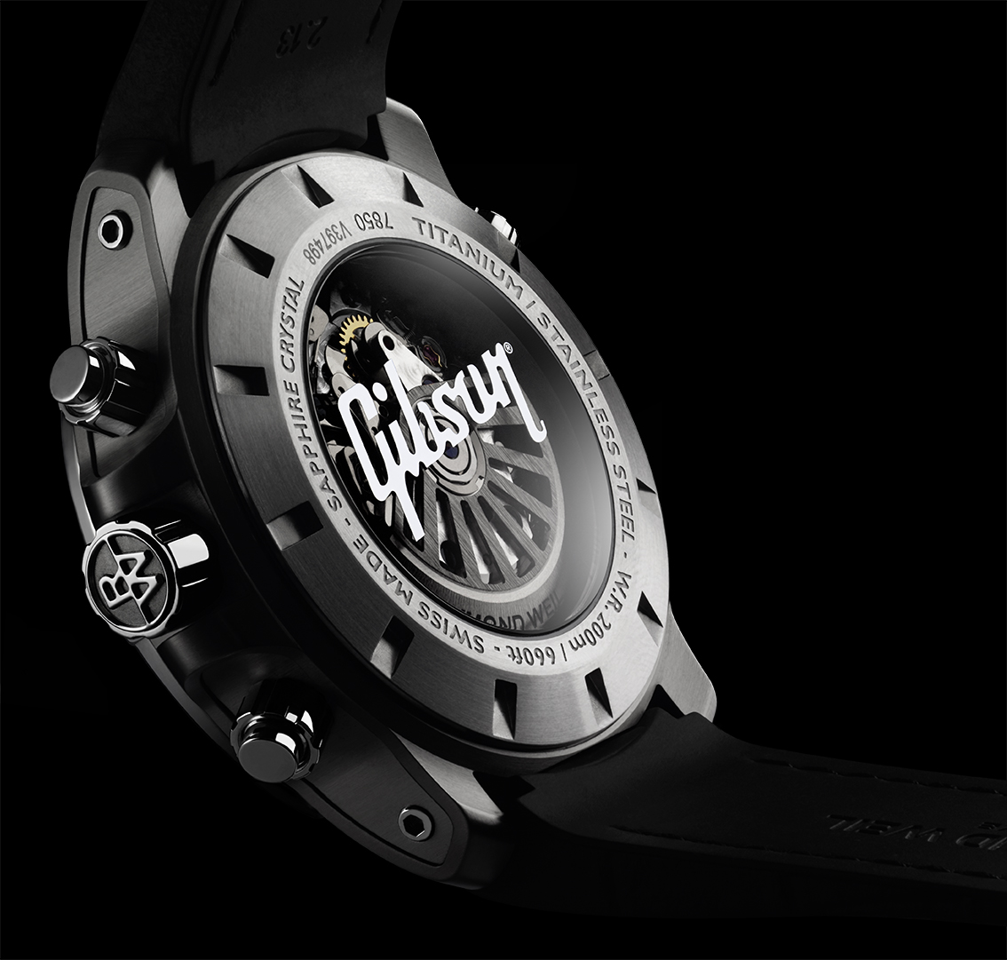 La montre est aussi dotée d’un mécanisme à chronographe à remontage automatique RW5010 et possède une réserve de marche de 46 heures et 27 rubis. Son boîtier est en acier et titane pour un diamètre de 46mm. Au dos de cette montre, on retrouve un verre permettant d’entrevoir les entrailles de cette montre et sur lequel on retrouve le logo Gibson.