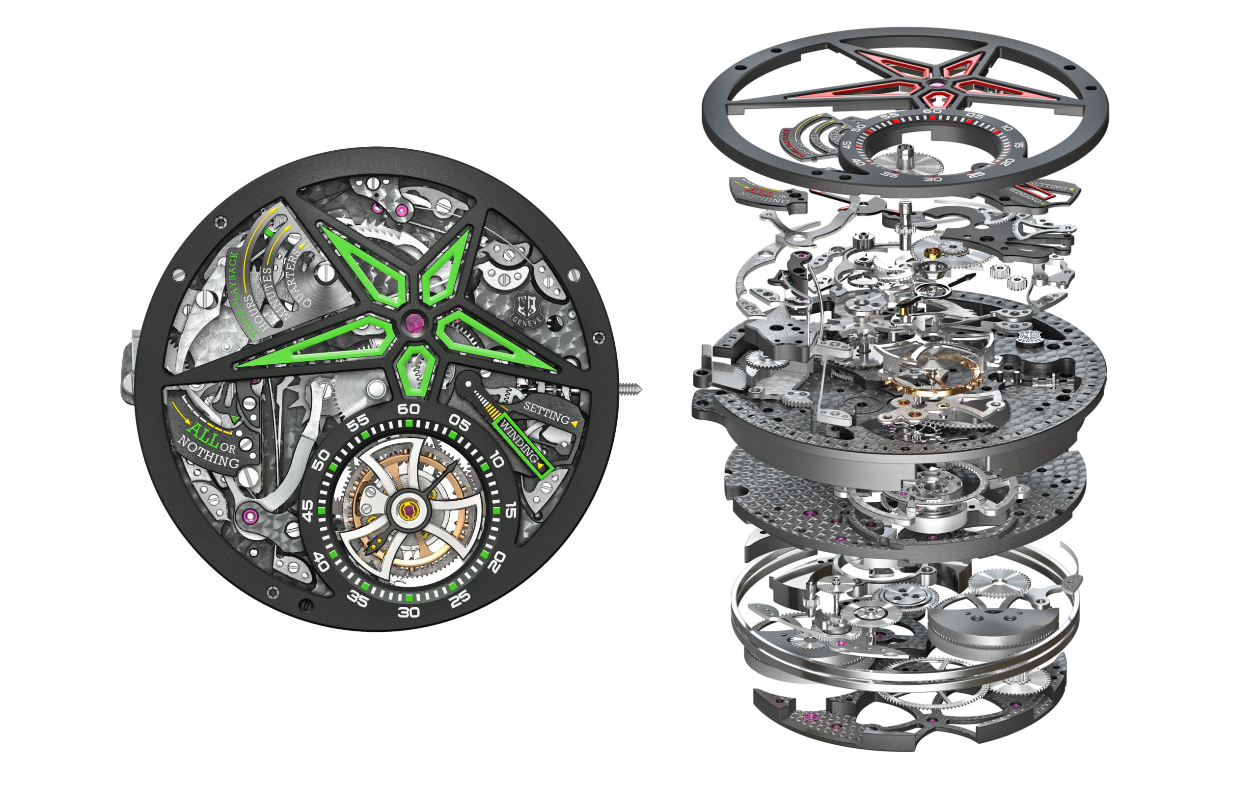 L’Excalibur Spider Unique Series est dotée d’un tourbillon volant remonté par deux micro-rotors se décline en 47mm et embarque le calibre RD107 composé de 558 composants, 54 rubis, oscille à 3 Hz (21’600 Alt/H) et possède une réserve de marche de 72 hours. La platine et pont sont perlés, satinés, microbillés et décorés Côtes de Genève avec revêtement NAC.