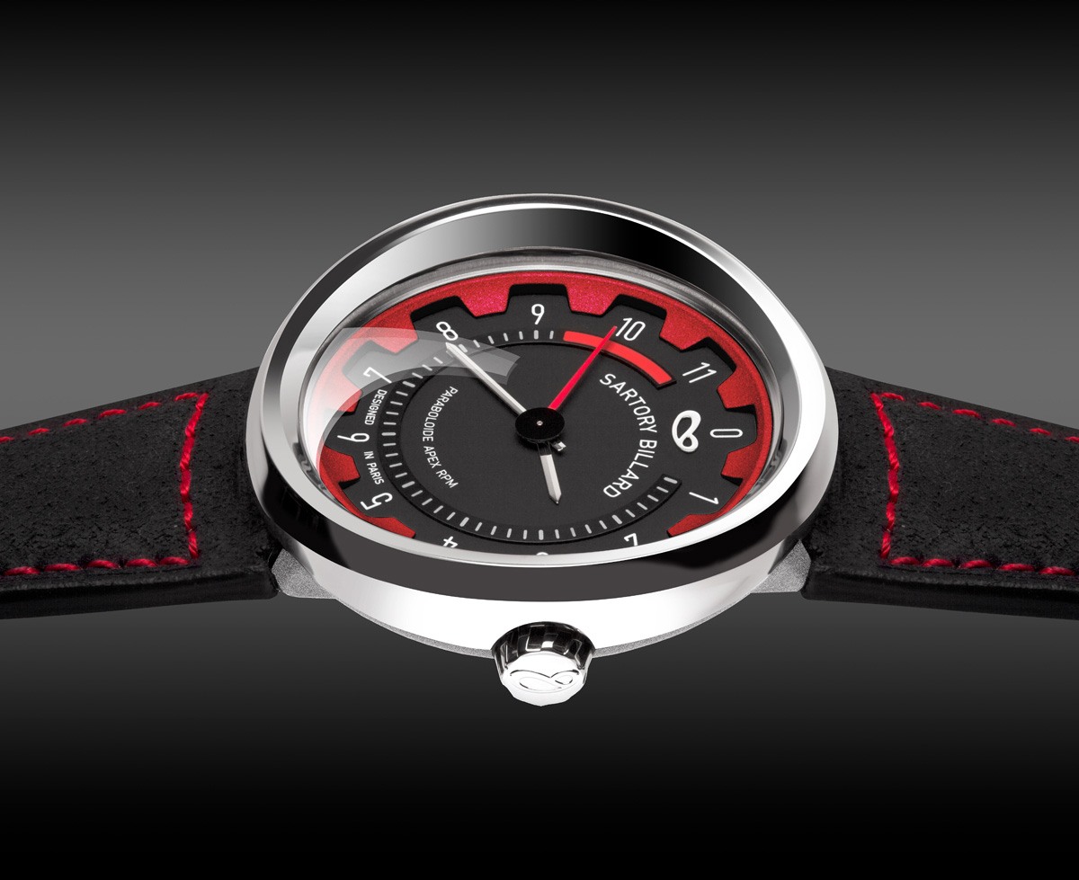 La Sartory Billard RPM01 se veut d’inspiration liée au monde de l’automobile sportive et leur idée de départ était simple, ils voulaient emporter au poignet ce qui fait l’âme de l’automobile sportive : un compte tours sportif et c’est de là que vient le nom de ce modèle, RPM, pour Rotation Par Minute.